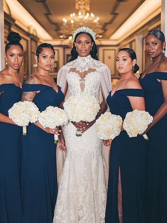 Vestidos de dama de honor asimétricos, sin mangas, con hombros descubiertos y encaje de crepé elástico de corte trompeta/sirena