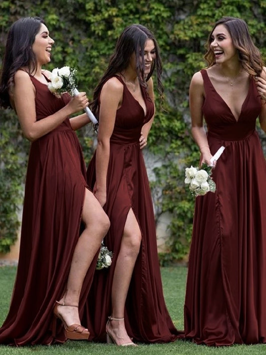Vestidos de dama de honor de corte A/princesa, de satén tipo seda, fruncidos, escote en V, sin mangas, con cola larga