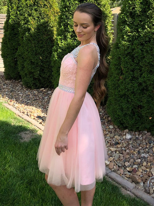 Vestidos de fiesta cortos/mini de corte A/princesa con escote redondo de tul, sin mangas y con cuentas