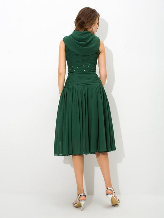 Vestidos cortos de gasa sin mangas, corte princesa, con pliegues y escote redondo