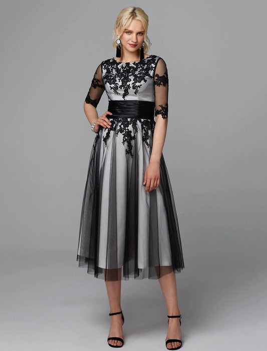 Vestido vintage de corte A para invitada de boda, largo hasta la rodilla, media manga, cuello joya, encaje con apliques de faja/cinta