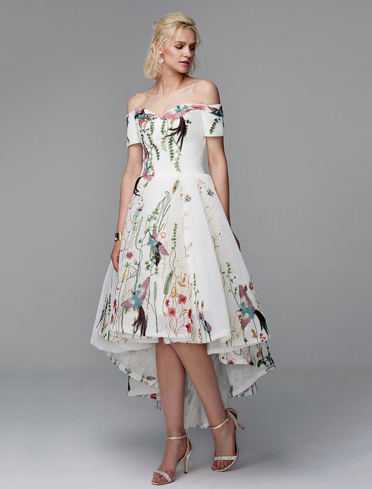 Vestido de fiesta bonito para invitada de boda, asimétrico, manga corta, hombros descubiertos, poliéster con bordado