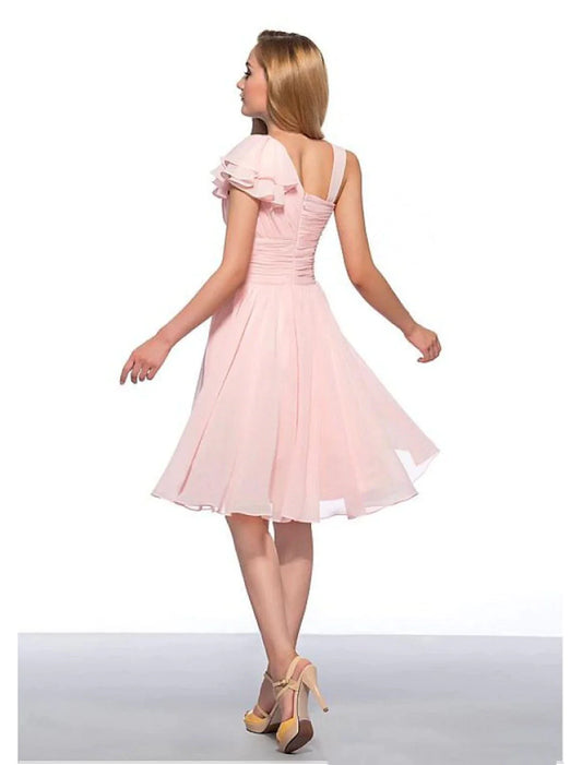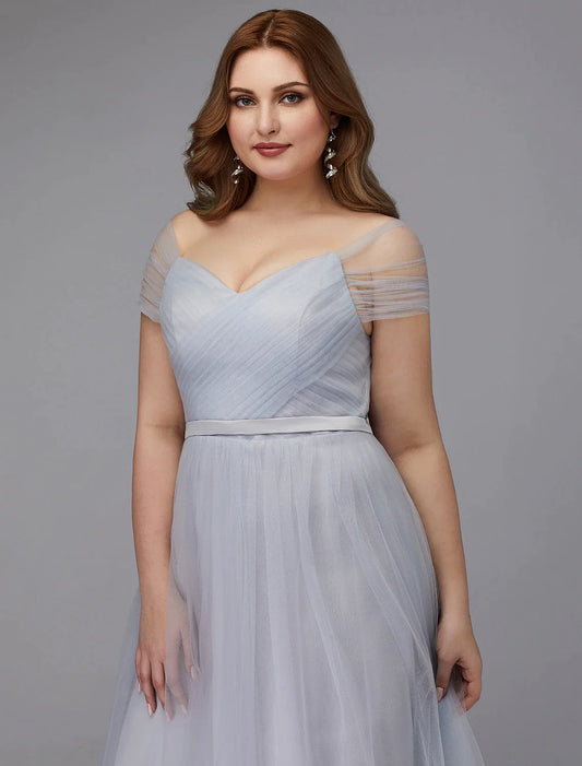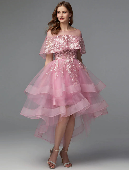 Vestido elegante de corte A para invitada de boda, largo hasta la rodilla, manga corta, hombros descubiertos, tul con faja/cinta cruzada