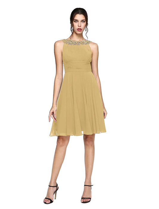 Vestido elegante de corte imperio para fiesta de cóctel de compromiso, cuello joya, sin mangas, largo hasta la rodilla, de gasa con fruncido
