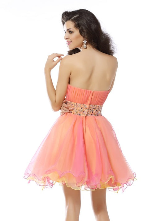 Vestidos de cóctel cortos de organza con corte A/princesa, sin tirantes, con cuentas y sin mangas