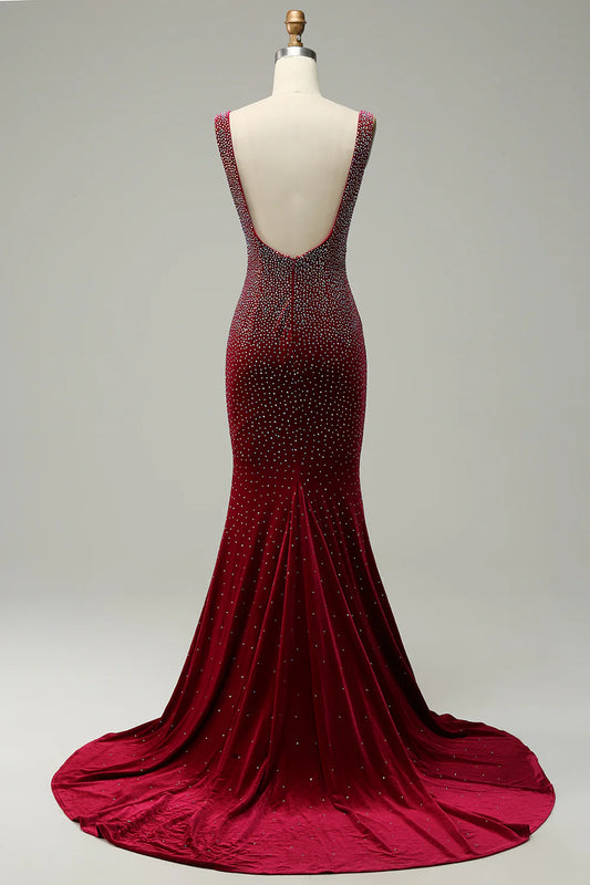 Vestido de fiesta largo color burdeos con escote en V profundo y sirena con cuentas de Amzcw