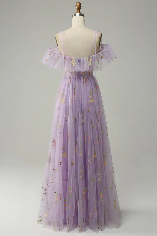 Vestido de fiesta largo color lavanda con escote en V, tirantes finos y bordado con abertura