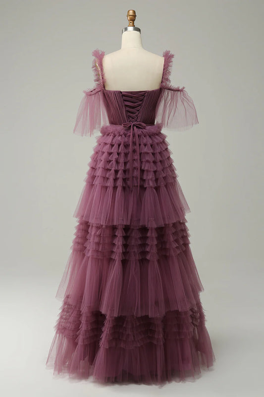 Vestido de fiesta largo morado con tirantes finos y apliques de sirena