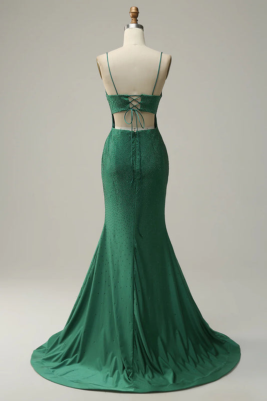 Vestido de fiesta largo verde oscuro con tirantes finos y sirena y cuentas