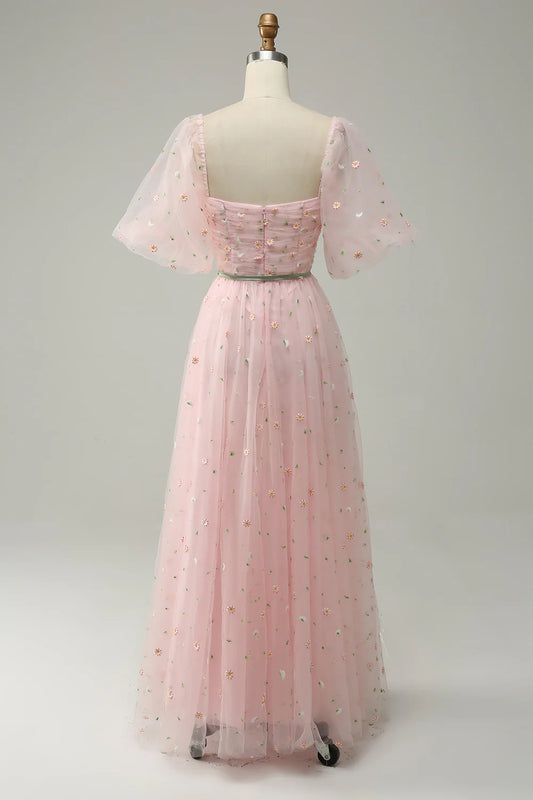 Vestido de fiesta largo en color rubor con escote en forma de corazón y bordado