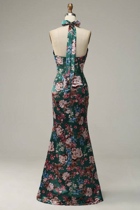 Vestido de fiesta de satén con cuello halter y estampado floral