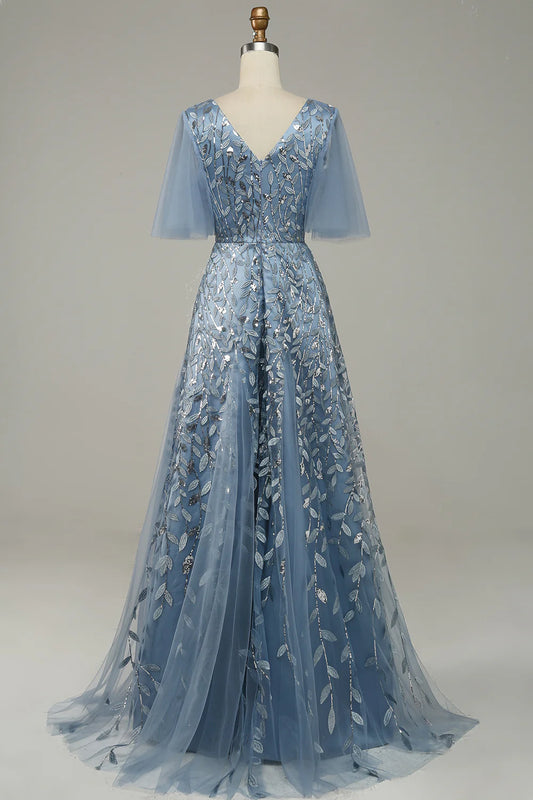 Vestido de fiesta con hojas bordadas en tul azul grisáceo