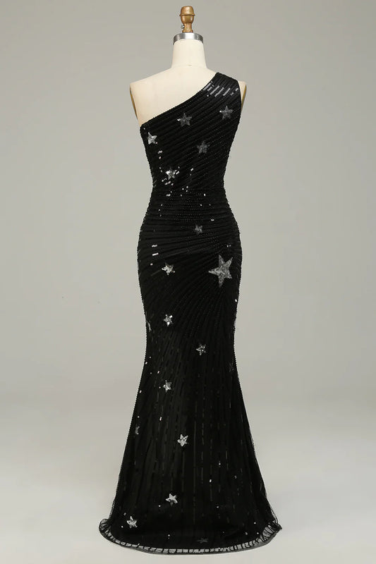 Vestido de fiesta largo negro de sirena con lentejuelas y un hombro con estrella