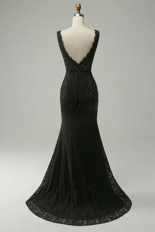 Vestido de fiesta largo de sirena con escote en V profundo y encaje negro con cuentas