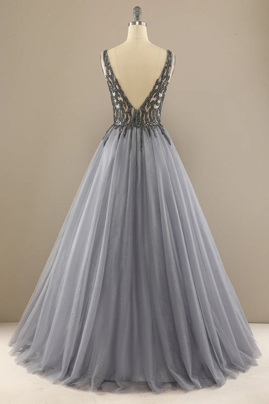 Vestido de fiesta largo con cuello en V y cuentas en gris