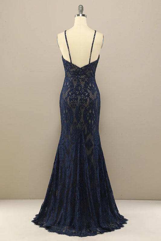 Vestido de noche largo de tul azul grisáceo con corte en A