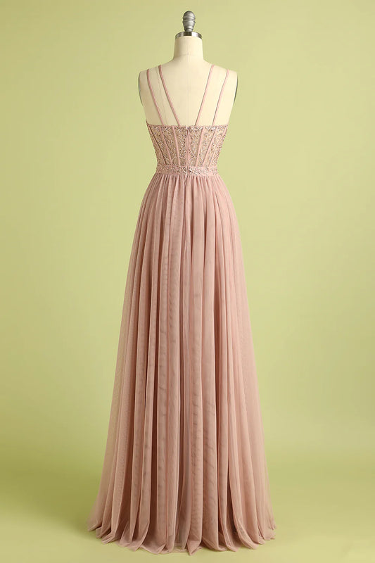 Vestido de fiesta rosa con tirantes finos y abertura delantera