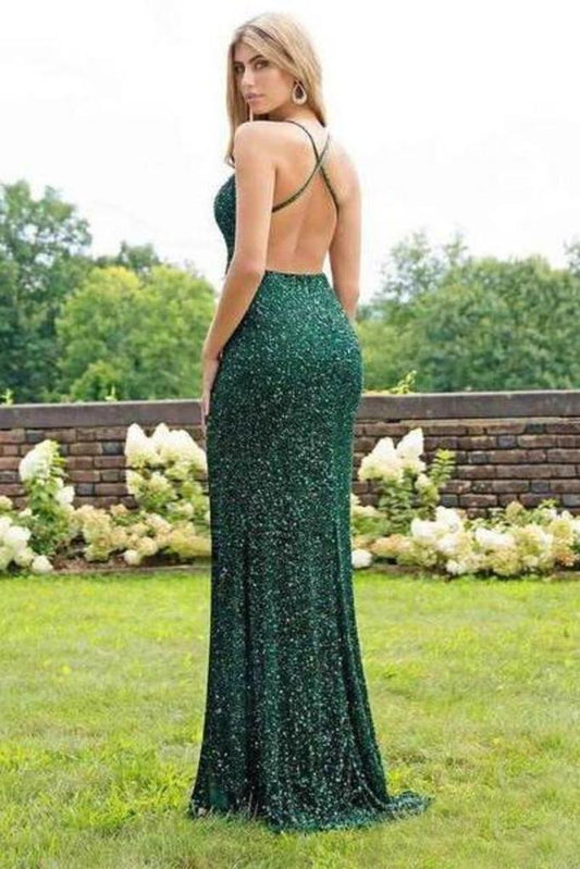 Vestidos de fiesta sexys de corte trompeta/sirena con tirantes finos, escote en V, lentejuelas y espalda abierta con abertura