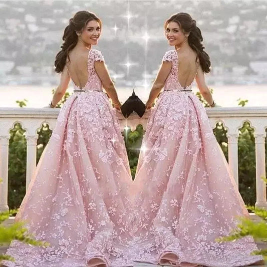 Vestido de fiesta de sirena con apliques de encaje rosa, tul, mangas cortas, espalda descubierta
