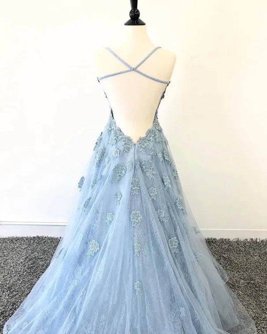 Vestido de fiesta azul cielo de tul con tirantes finos, espalda cruzada y apliques de encaje.