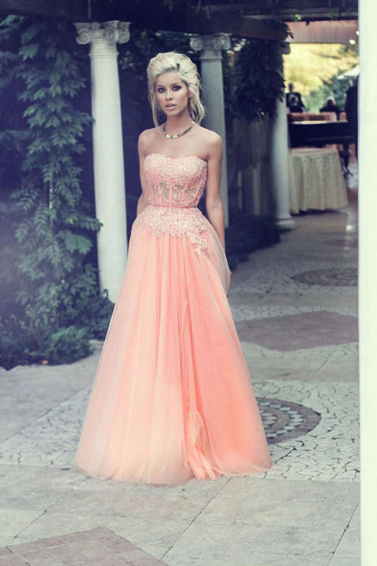 Vestidos de fiesta de tul con cuentas rosa ruborizado, sin tirantes, con apliques de encaje y hasta el suelo