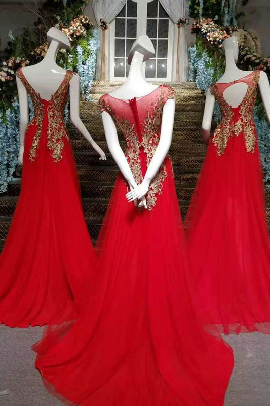 Vestidos de princesa rojos de Sister, corte A, con cordones, escote redondo y apliques dorados