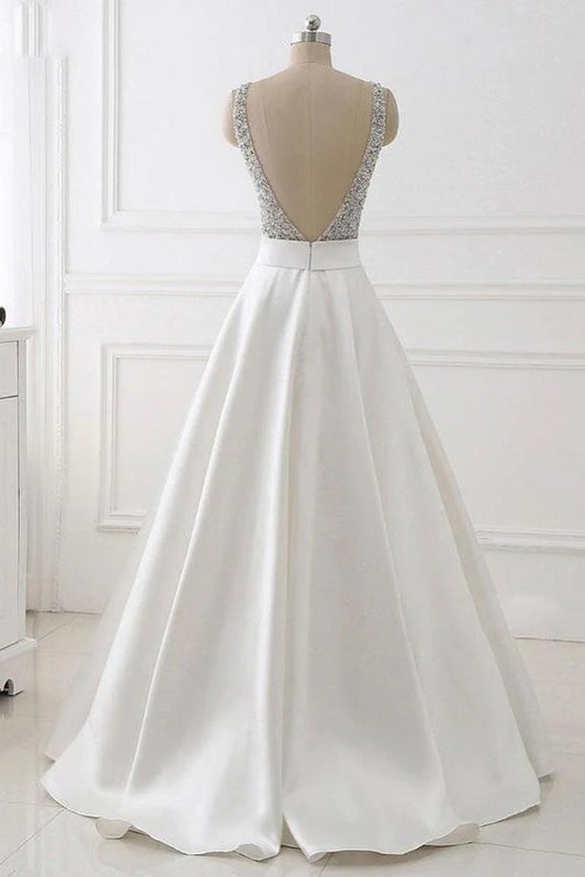 Impresionante vestido de fiesta de noche color marfil con escote en V, satén, sin espalda, sin mangas y con cuentas