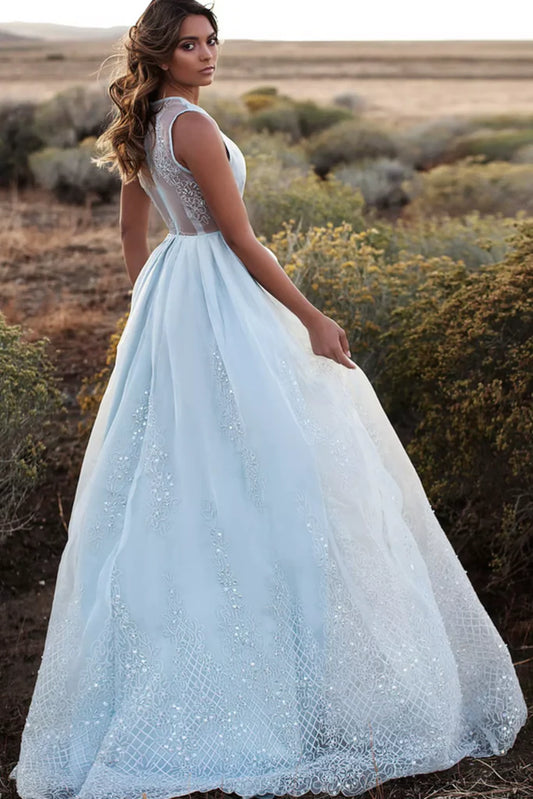 Hermosos vestidos de fiesta largos con escote redondo y bordados en forma de A para noche
