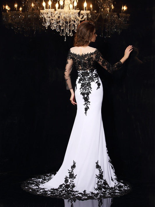 Vestidos de jersey con cuello alto, manga larga, corte trompeta/sirena y cola larga
