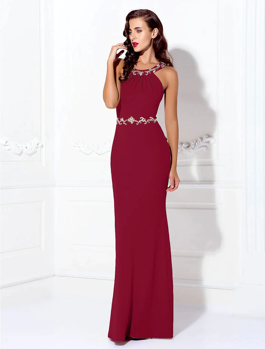 Vestido tubo/columna con espalda hermosa, para invitada de boda, largo hasta el suelo, sin mangas, estilo halter, licra, espalda cruzada con cuentas