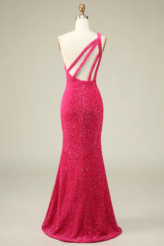 Vestido de fiesta largo de sirena con un solo hombro y lentejuelas fucsias, de Amzcw, con abertura frontal