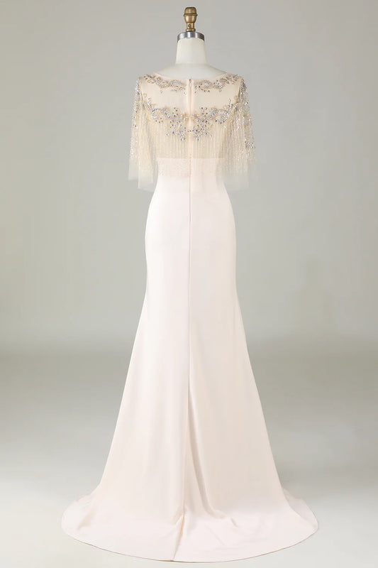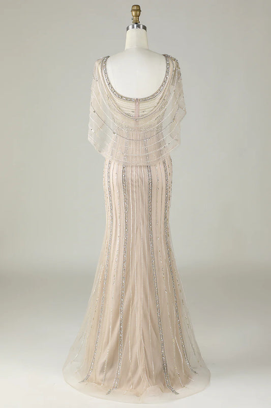 Vestido de fiesta largo de sirena con cuentas y escote barco color champán brillante de Amzcw