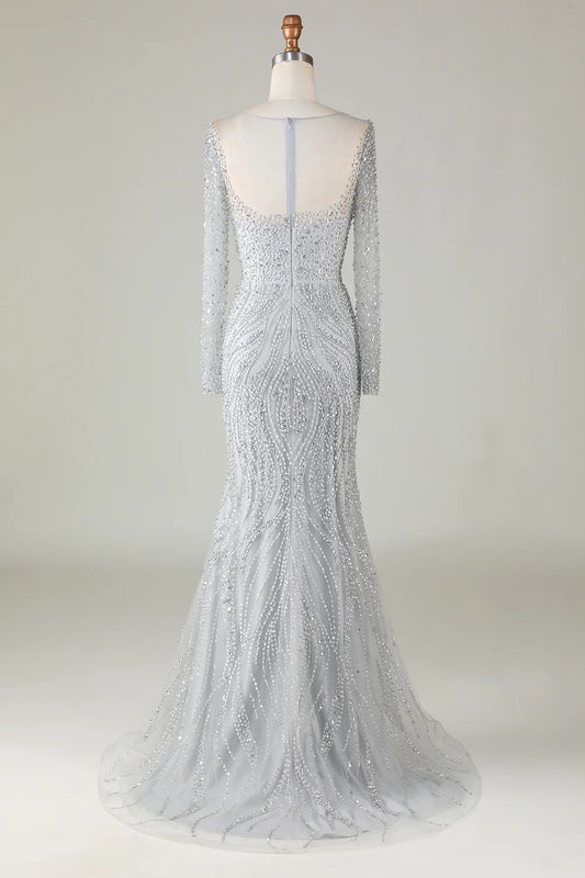 Hermoso vestido de fiesta largo estilo sirena con cuentas grises brillantes de Amzcw