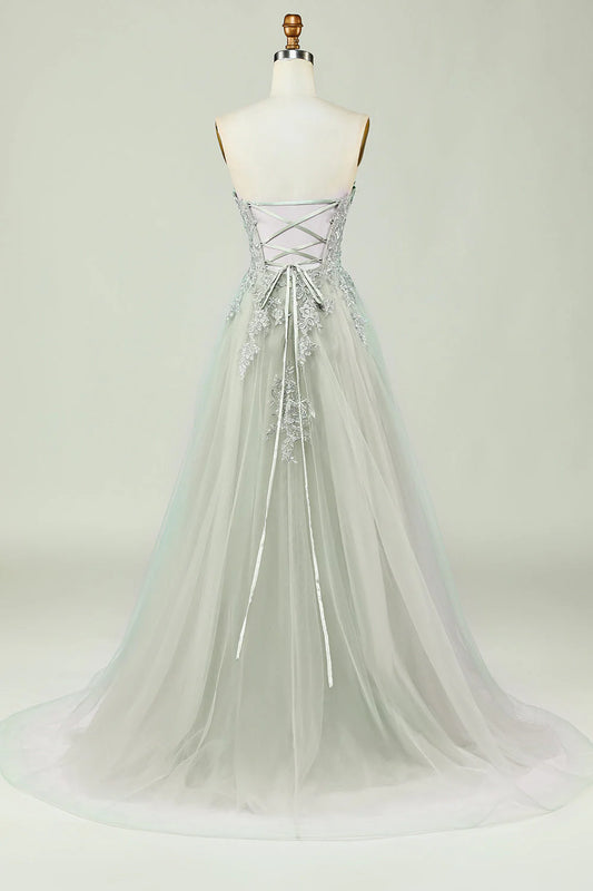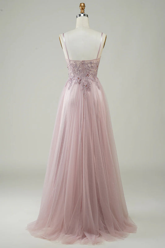 Vestido de fiesta largo de tul con apliques y corsé en línea A color ruborizado de Amzcw