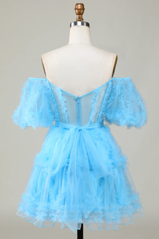 Vestido corto de fiesta Amzcw con escote en A, de tul azul y hombros descubiertos