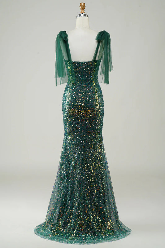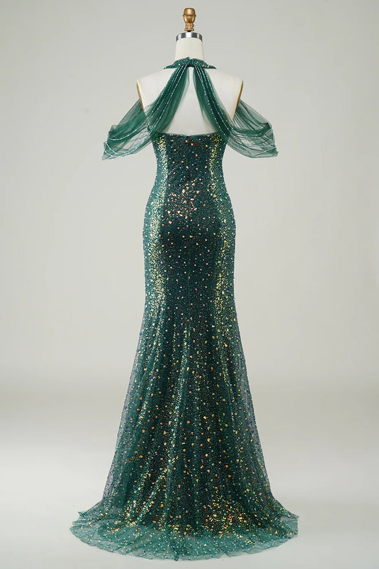 Vestido de fiesta largo con lentejuelas y corte sirena verde oscuro brillante de Amzcw con abertura