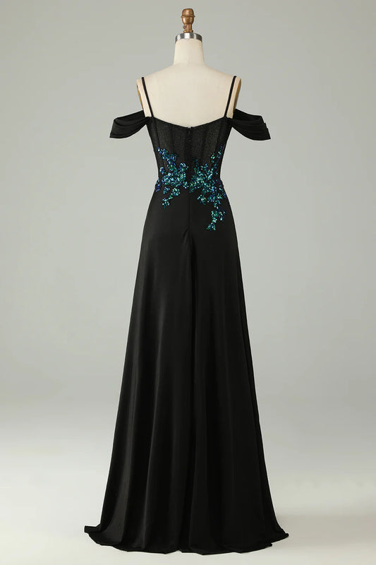 Vestido de fiesta largo con corsé y lentejuelas negras con hombros descubiertos de Amzcw