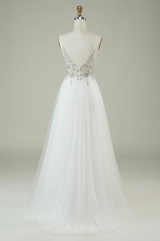 Hermoso vestido de novia largo de tul blanco con tirantes finos y corte A de Amzcw