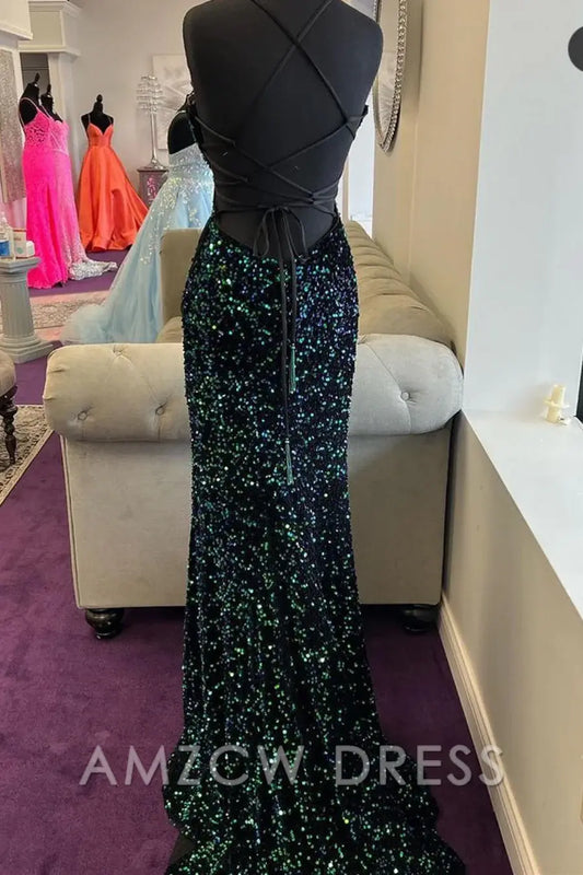 Vestido formal largo con tirantes finos y lentejuelas verde oscuro de Amzcw.