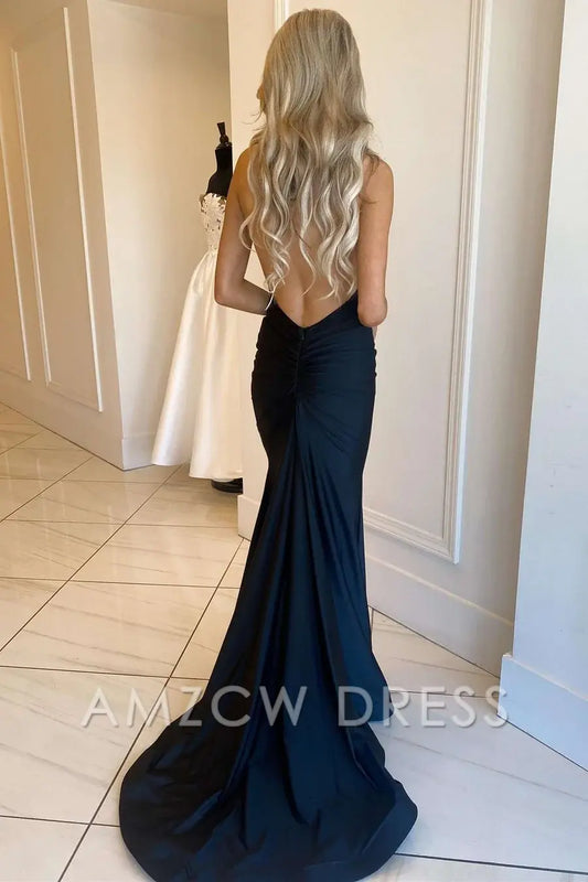 Vestido largo de sirena con corsé de cuentas azul marino sencillo Amzcw con abertura