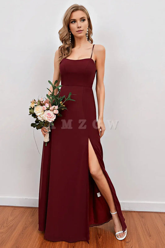 Vestido largo de dama de honor con tirantes finos color burdeos y abertura de Amzcw. Tiendas de vestidos de fiesta y vestidos de noche.
