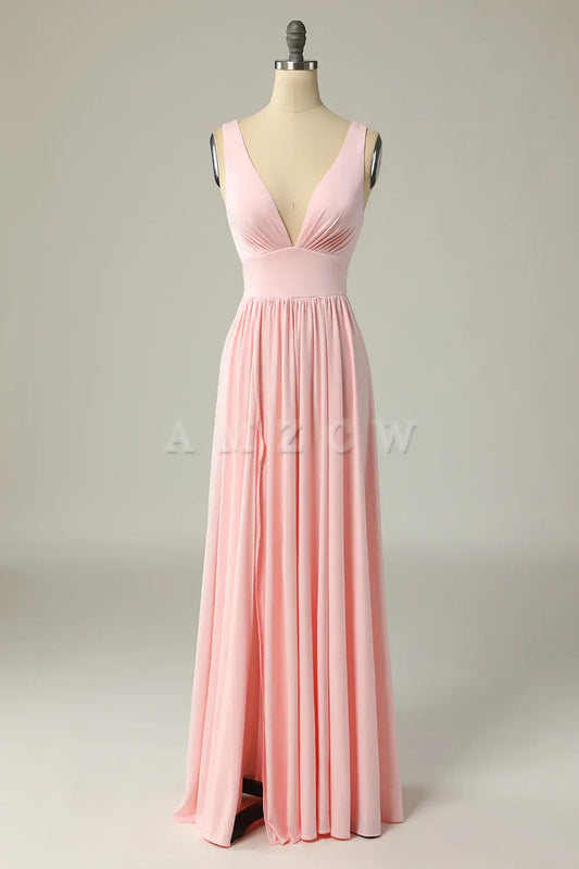 Vestido de fiesta largo rosa con escote en V y corte A clásico de Amzcw con abertura frontal, vestidos de noche, vestidos de fiesta, tiendas de vestidos.