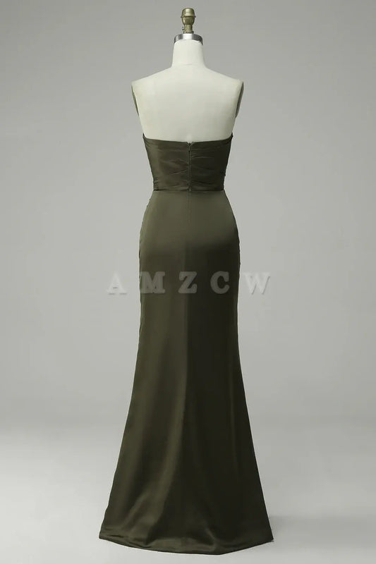 Vestido de fiesta de sirena de satén verde sin tirantes Amzcw con abertura, vestidos de noche, vestidos de fiesta, tiendas
