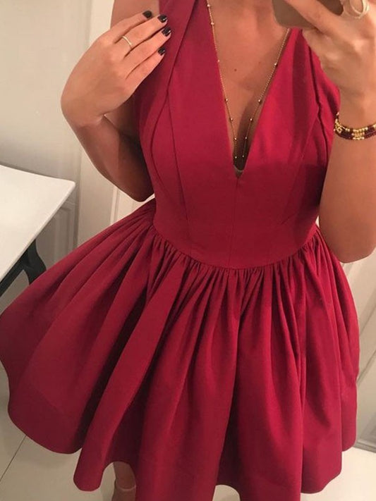 Vestidos cortos/mini de satén fruncido, sin mangas, corte A/princesa, escote en V