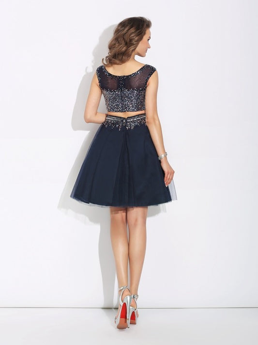 Vestido de dos piezas de corte A/princesa, con escote barco, sin mangas, con cuentas y red corta