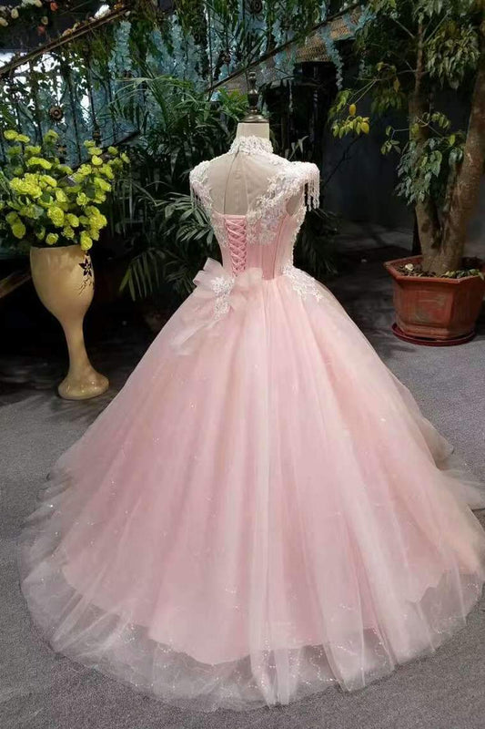 Nuevos vestidos de quinceañera rosas con encaje, apliques y cuentas.