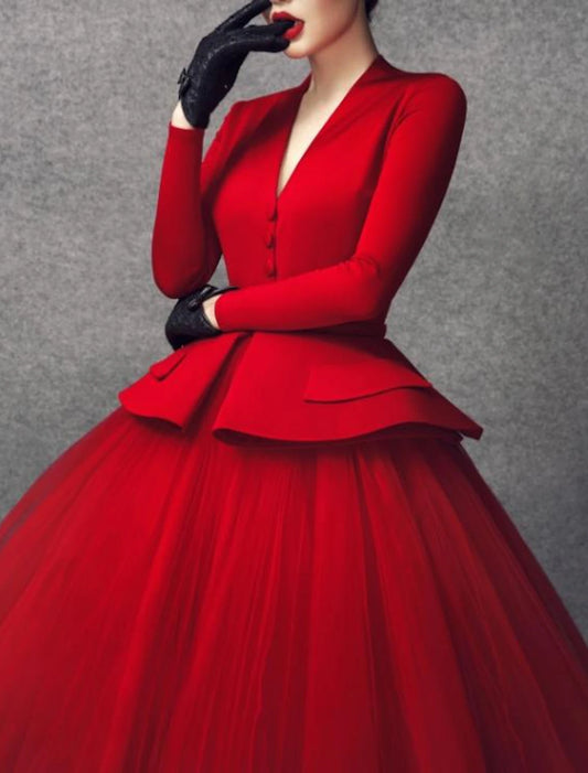 Vestido de fiesta elegante vintage de quinceañera, cóctel, escote en V, manga larga, largo hasta la rodilla, de tul con pliegues