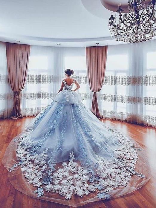 Vestido de novia de quinceañera largo azul claro con espalda descubierta y bonito diseño de princesa