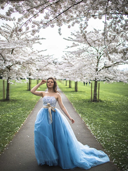 Vestidos de fiesta sin mangas de tul con cola larga y escote corazón con apliques