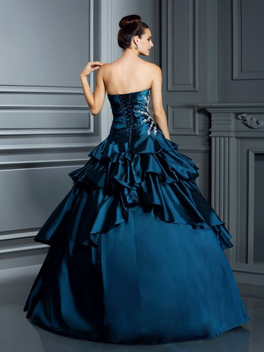 Vestidos de quinceañera largos de tafetán sin mangas con flores hechas a mano y escote corazón